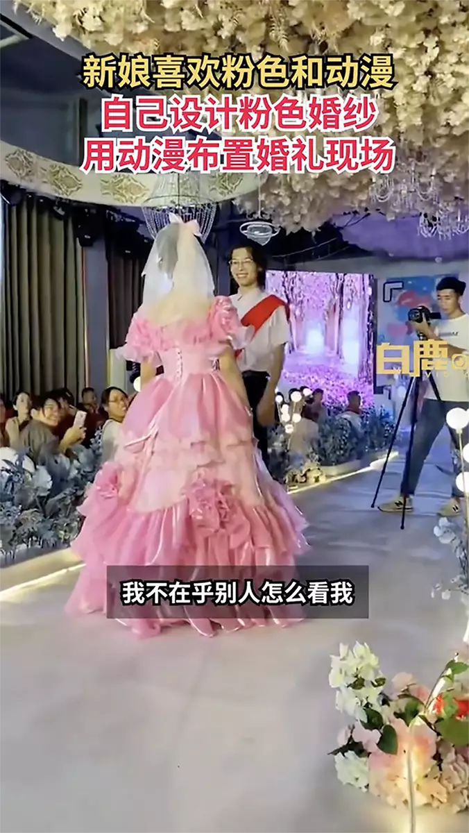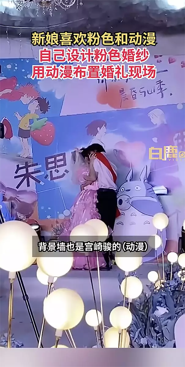 對此,涉事的新娘表示,自己喜歡粉色,也喜歡動漫,就親手畫圖設計,托婚紗店花半個月制作了這套獨特的婚紗,婚禮背景墻也放的是宮崎駿的動漫,覺得整個婚禮現場都是自己設計制作的感覺很好。她不在乎別人怎麽看待,自己開心就好。