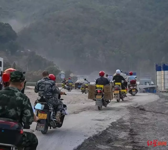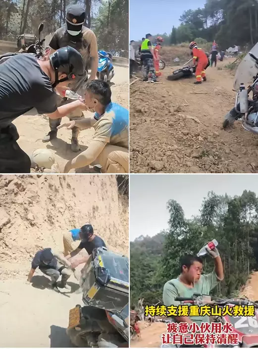 因此,在官方救援隊伍外,重慶多區還發布了志願者招募通知。其中,一支摩托車志願者救援大隊引發了關注。這群至少500輛的90後「摩托騎士」志願者加入山火救援,他們騎著自己的摩托車、背著背簍在高溫下分批接力運送物資和滅火設備,即使曬到嗓子發啞、摔傷,仍堅持在第一線。