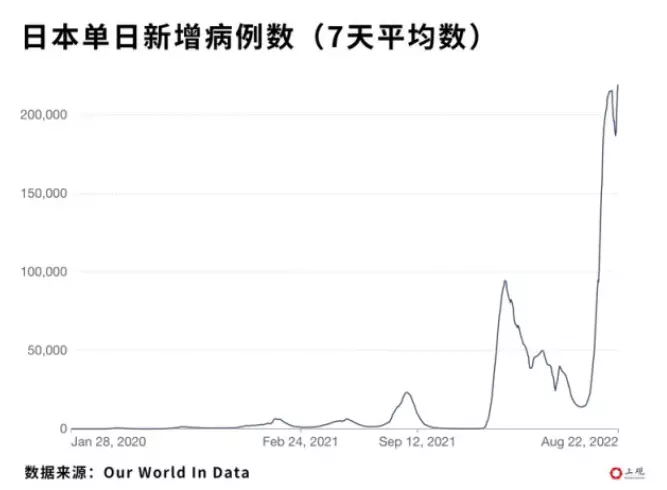 7月31日,單日新增病例數突破20萬;在8月11日,疫情曾短暫出現過「拐點」,此後7天新增病例數呈下降趨勢;但在8月18日,疫情反彈,8月21日,日本單日新增病例數再創新高,接近22萬人確診。