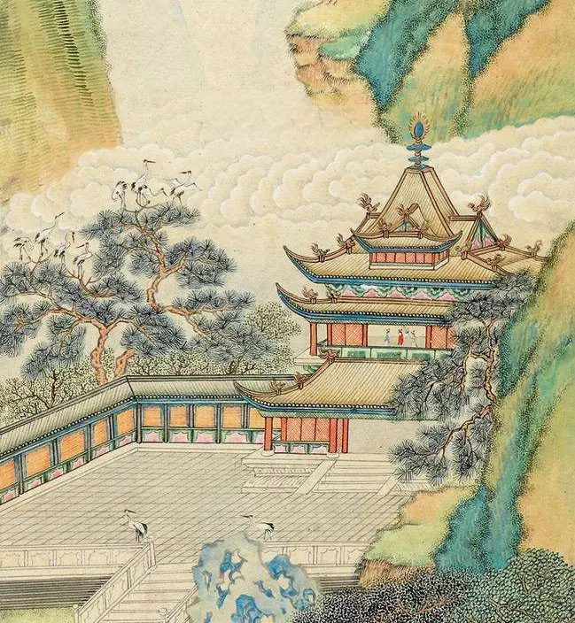 從前有兩個仙人,一個叫王遠,而另一個則叫麻姑。有一次,兩人一同相約他們好友蔡經的家中歡聚暢飲。只不過那天王遠沒有等上麻姑,而是自己一人先行出發。只見王遠在一批乘坐麒麟的吹鼓手和侍從的簇擁下,跨上龍車,神氣的往蔡經家出發。遠游帽子上一縷縷彩色的緩帶與身側虎頭形箭袋上的縷子隨風飄揚,顯的格外威風。