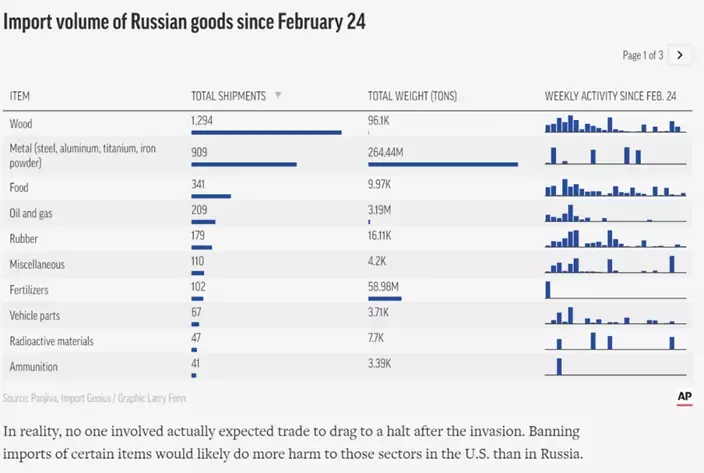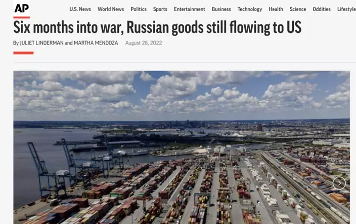 美聯社記者調查發現,自俄羅斯2月開始向烏克蘭發射導彈和進行空襲以來,至今仍然有至少3600多批木材、金屬、橡膠和其他貨物從俄羅斯運抵美國港口。與2021年同期的約6000批貨物抵達時相比,這一數字有明顯的下降,但平均每月的貿易額仍超過10億美元。