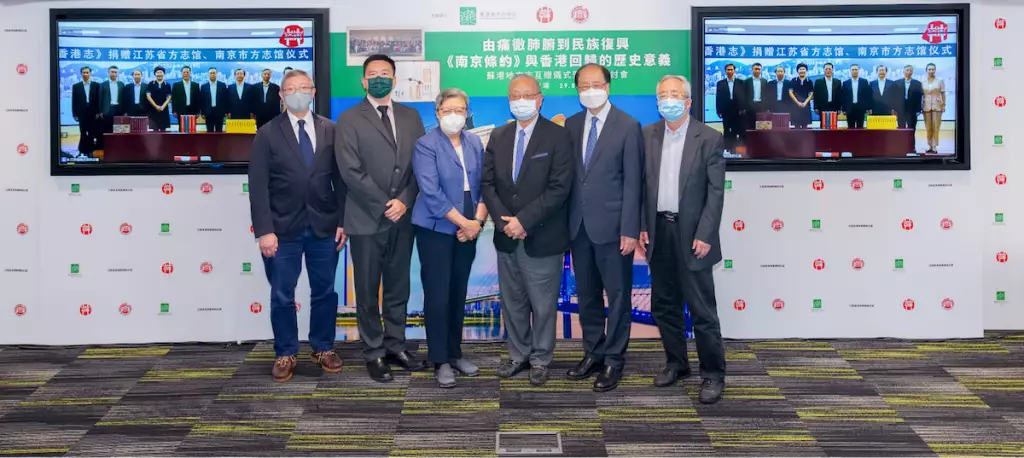 適逢《南京條約》簽訂180年,也是香港回歸25周年。香港地方志中心、江蘇省地方志辦公室及南京市地方志辦公室聯合舉辦「由痛徹肺腑到民族復興:《南京條約》與香港回歸」蘇港地方志互贈儀式暨主題研討會。政務司司長陳國基及江蘇省委常委、江蘇省人民政府常務副省長費高雲分別錄製視頻表達支持,冀通過活動進一步加強蘇港之間的經貿往來和文化合作。