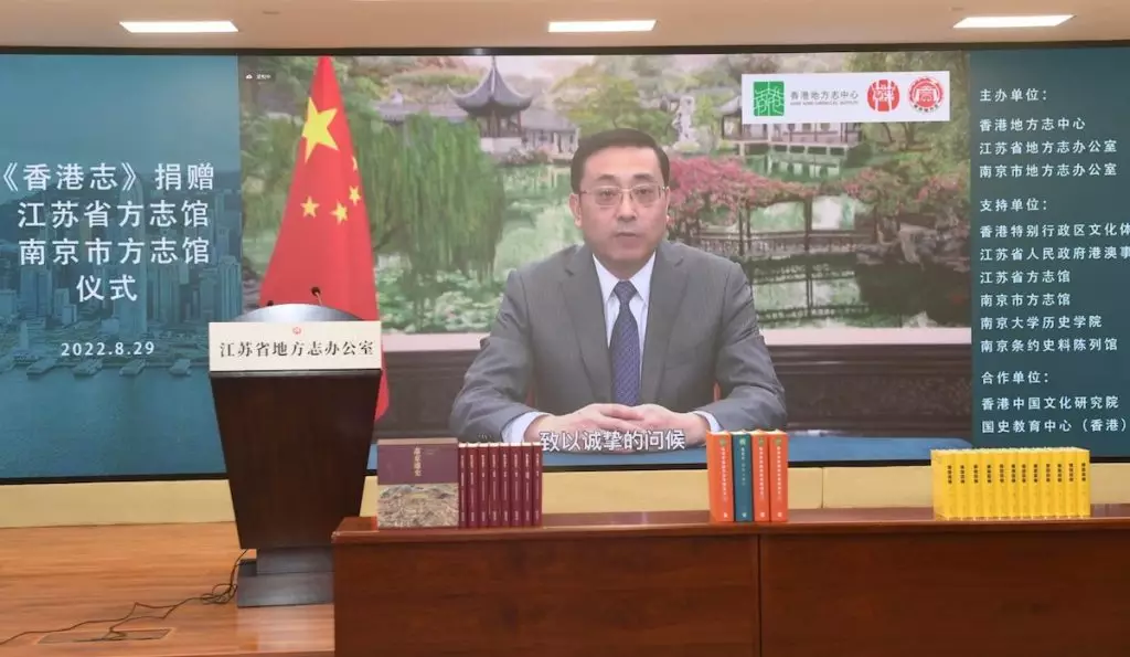 蘇港地方志互贈儀式全程網上直播,《浙江通志》副總纂顏越虎受香港地方志中心委託向江蘇省方志館、南京市方志館贈送《香港志》(包括《總述 大事記》及《香港參與國家改革開放志》),江蘇省地方志辦公室則向香港地方志中心回贈《江南通志》,而南京市地方志辦公室亦向香港地方志中心送贈《南京通史》。
