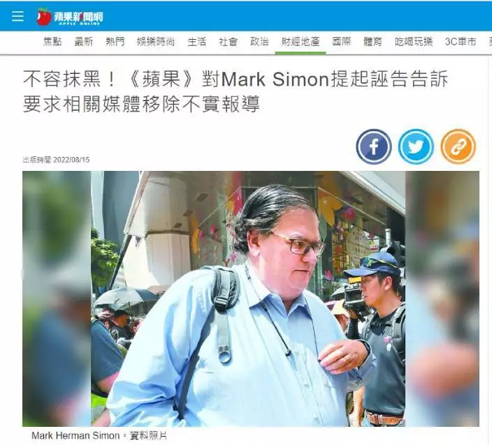 《台蘋》早前出聲明表示,會對Mark Simon進行誣告追訴。《台蘋》官網截圖。