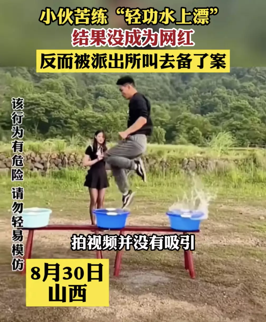 山西的一名男子因為熱愛習武,苦練了好幾年的「水上漂」。他可以踩水而過,踩氣球不破,徒手一步就攀上二層樓高的樓梯。他把自己「水上漂」,飛簷走壁的神技拍成了短片上傳網絡。網傳影片還沒有走紅,卻引起警察關注,被派出所傳去備案,網傳警方認為他「具有特殊技能」所以找上門了。
