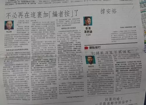 《明報》A28觀點版「香港革新論」作者方志恒及「醫法論政」作者黃任匡,均在欄目中「開天窗」,分別只寫上題目「撐安裕」及「哀哉明報」,黃在專欄中加上「作者按:本備千字長文,淺評安裕一案,以饗讀者。惟日前《明報》營運總裁甘煥騰發表『大方論』,筆者閱畢震驚不能自已。悲憤莫名,遂開天窗........。」