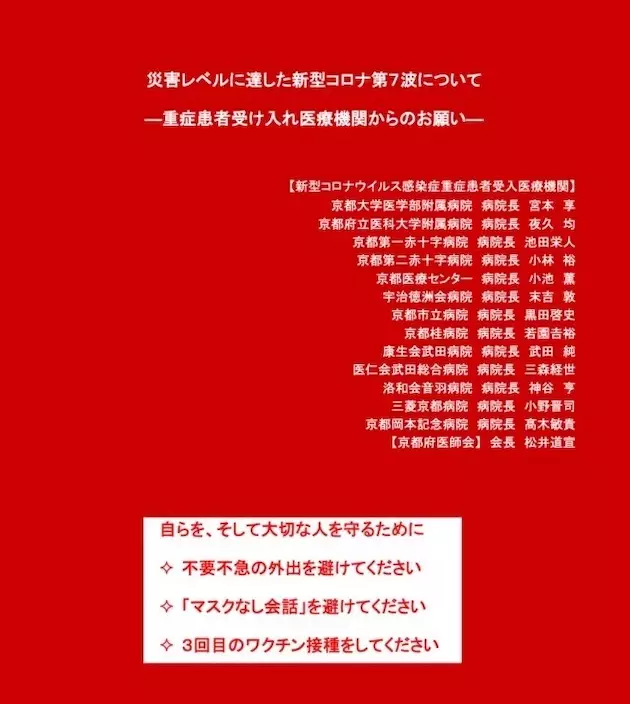 8月15日,京都府14家醫院與京都府醫師會就聯合發佈了緊急聲明,稱日本的新冠疫情蔓延已經達到「災難級別」。在京都,為新冠患者預留的床位達到飽和狀態,沒有一家醫院能立即接收病人,「急救醫療系統已陷入崩潰狀態,我們救不了那些本來可以輓救的生命。」