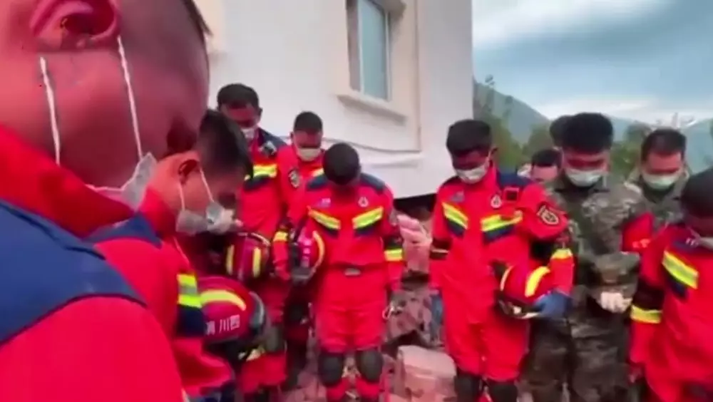 四川瀘定地震,中科院觀測站倒塌,1人遇難,救護人員為死者默哀。
