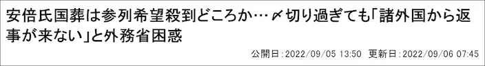 與其同時,日本政府一直以外國重要人物的出席人數和警備規模尚未確定為由,推脫公佈安倍葬禮費用。然而,原定於8月中旬報名參加的截止日期早過了,根本就沒幾個國家報名。日本政府遲遲未收到期待的回覆,「弔唁外交」或成一場空。