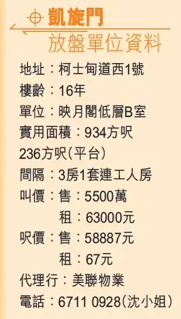 九龍站地標屋苑凱旋門,位於港鐵站上蓋,交通便捷。今日帶大家走訪屋苑映月閣低層B室,實用面積934方呎,3房1套連工人房設計,連236方呎特色平台,現時叫價5500萬,同時放租63000元。