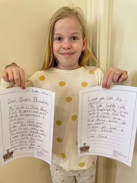無獨有偶,遠在南半球澳洲的一名8歲女童奧莉薇亞·阿克斯(Olivia Akers)同樣在6月份寄出一封信給女皇,除了附上一系列自己打扮成皇室成員,身穿軍服宛如參加閱兵典禮,騎乘一匹名叫「夫人」(Lady)小馬的照片。內容還寫下,「親愛的伊利沙伯女皇,我真的很喜歡妳和柏靈頓熊的那部下午茶影片,妳真的喜歡吃桔子醬三明治嗎?希望你會喜歡我的照片。」接着說,「我的小馬『夫人』牠來自澳洲,鞍具來自英國,想問你有幾匹馬呢?」