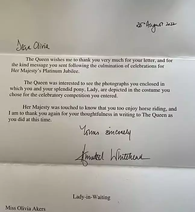 不過近日女皇離世的消息讓她一度以為沒望收到回信,但耐心等待終於有回應,同一天一封來自巴摩拉城堡(Balmoral Castle)的信件抵達,女童母親回憶道,「郵差說,我有一封非常特別的信要簽收」。署名為宮女安娜貝爾(Annabelle Whitehead)。她表示,「女皇得知妳也喜歡騎馬相當感動,也對妳的照片非常有興趣,還有『夫人』小馬……再次感謝妳的體貼。」