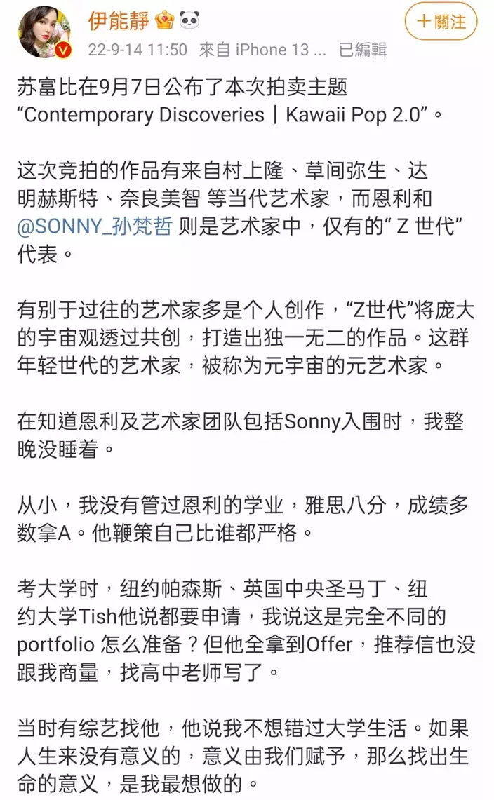 14日伊能靜出po分享,指蘇富比今次拍賣主題是「Contemporary Discoveries|Kawaii Pop2.0」,這次競拍的作品有來自村上隆、草間彌生、達明赫斯特、奈良美智等多位當代藝術家,而恩利和孫梵哲則是藝術家中,僅有的「Z世代」代表。