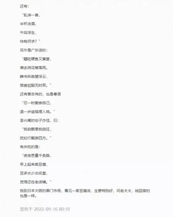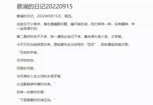 近年小毛病諸多的蔡瀾,要看醫生覆診,他也在文中提及精神狀況:「這些日子少練字,首先是睡眠問題,睡不夠的話,和打麻將一樣,沒有精神,字一定寫得不好。第二是好的句子不多,我一遇到必定記下來,集合得七條八條,才舉筆。」他指自己喜歡的一句是:「下廚是最好的減壓法。」還有:「亂詩一首,半杯濁酒,午後浮生,快哉何求?」、「醒咗餵魚又黃昏,懶去淋花等落雨。睇書聽曲望浮雲,餓食攰瞓無時辰。」又指李興禹的句子亦佳:「我自飄零我自狂,猶如行鶴遊四方。」最後離不開食,他寫道:「夜夜思量千條路,早上起來賣豆腐,豆多水少出名堂,覺悟還在老店鋪。」表示到日本大阪的黑門市場,看見一家豆腐店,生意特別好,問老太太,她回答的也是一樣。