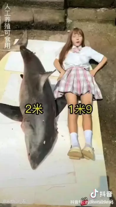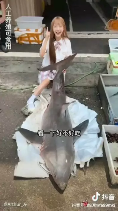 女網紅在店舖外將包裹拆開,內裝一條體型碩大的鯊魚。