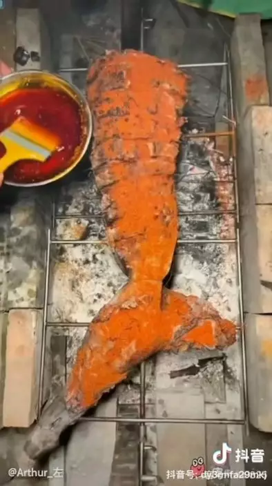 鯊魚尾部用來燒烤,魚體上灑滿了紅色調料。