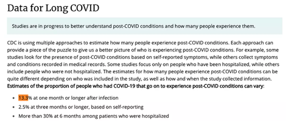 由於美國新冠患者基數過於龐大,大量民眾正受到「長新冠」的困擾。美國疾病控制與預防中心數據顯示,全美所有新冠患者中,有13.3%的人在感染1個月後仍存在以上症狀;有2.5%在感染3個月後仍存在以上症狀;而在住院治療的新冠患者中,有超過30%在感染6個月後仍存在以上症狀。