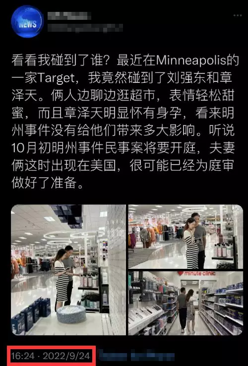 內地網紅章澤天在2009年、年僅17歲時憑一張手捧奶茶的清純學生相而爆紅,被內地網民封為「奶茶妹」,2015年她閃嫁大20歲的京東集團創辦人、執行長劉強東,婚後二人育有一女。近日,有網友曬出在美國超市偶遇劉強東章澤天夫婦,並在網上分享了偶遇二人的相片,引來網友們的熱議。
