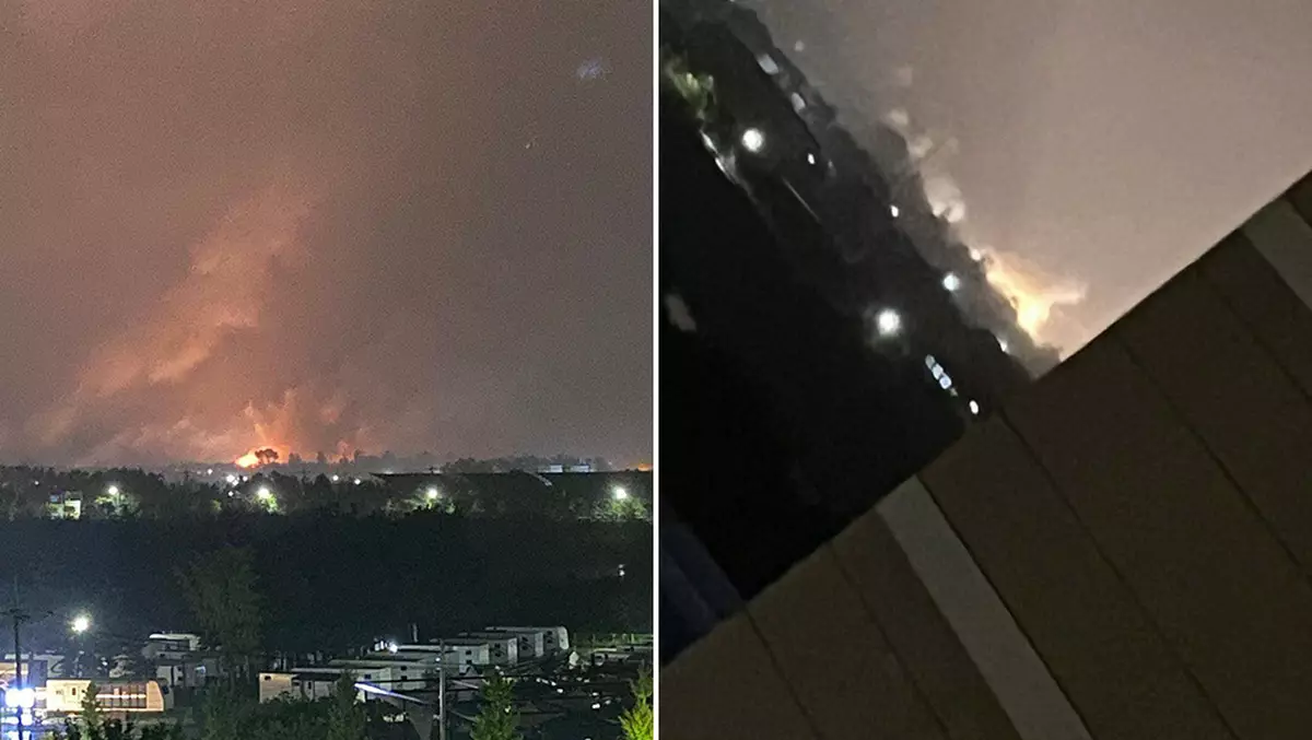 網上片段顯示江陵市一個空軍基地附近出現一個巨大的橙色火球。網圖