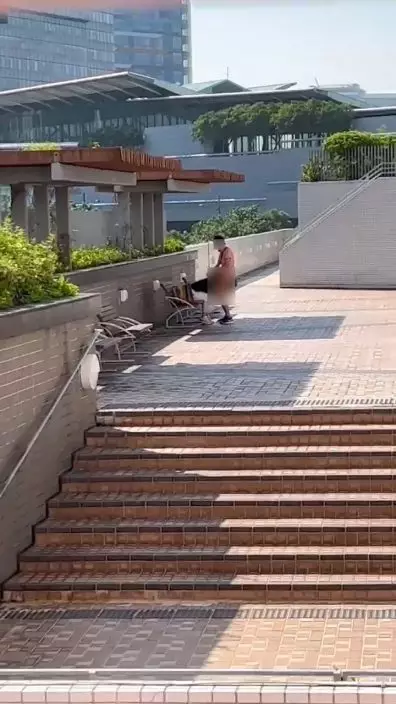 男方神態相當享受,站在長椅旁穩如泰山,一動不動。