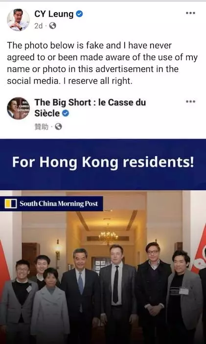 近日一個海外網站登出一段消息,引述《南華早報》的報道,說全球首富馬斯克在港推出一個數碼投資平台,投資者可獲極高回報,並登出一張振英哥與他的合照。此 post古古怪怪,一睇就知唔妥,振英哥隨後澄清,沒同意自己的照片與名字用於此廣告,而《南華早報》更直指成段報道是偽造的,全是魚目混珠。