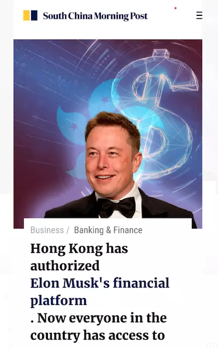 這段「假新聞」在一個有新加坡名稱的海外網站發放,偽造《南華早報》的報道說,馬斯克在港推出這數碼投資平台,專為香港人而設,最低投額是 2000元,每周可賺5000元,並可即時註冊及存款,好快有錢收,確是巨型蛤乸。報道署名竟用了該報的資深財經記者個名和相片,文中還引述金管局總裁余偉文等的話,講到似層層咁。