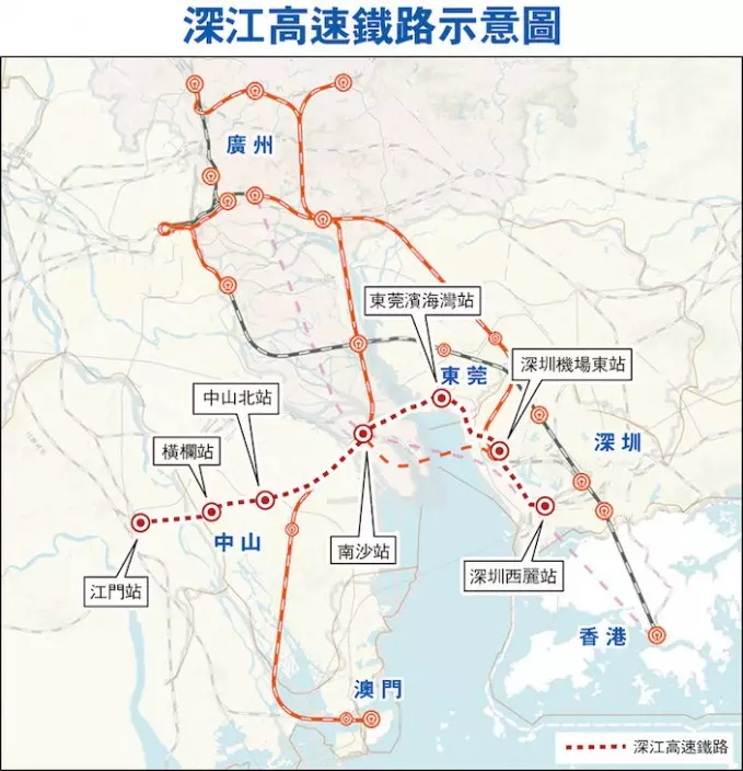 一、深江高鐵全長116公里,途經深圳、東莞、廣州、中山、江門5市;全線共設7站,分別是(深圳)西麗、深圳機場東、東莞濱海灣、(廣州)南沙、中山北、(中山)橫欄、江門。
