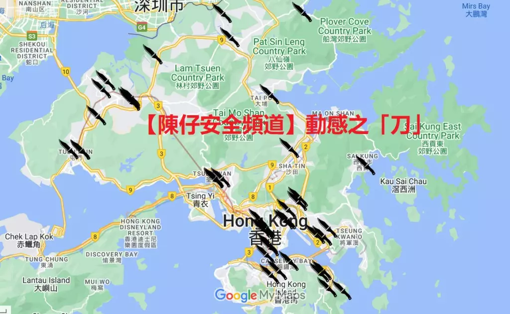 持刀行劫或傷人案近期有所增加。前立法會議員陳沛然近日自製「安全頻道」,在地圖上列出今年與刀有關案件的地點。