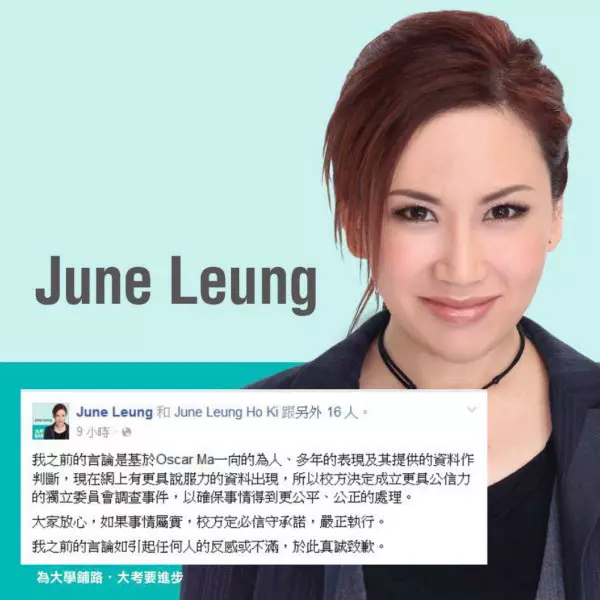 遵理學校創辦人梁賀琪(June Leung)早前曾指涉事女學生涉嫌造假和「搏上位」,她凌晨在社交平台表示,早前的言論是基於對Oscar Ma一向的為人、多年的表現及其提供的資料作判斷,為早前的言論致歉。