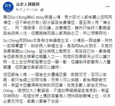 有KOL指So Ching面對變故可以做嘅只喺網上放兩句負,希望網民可理解同包容。