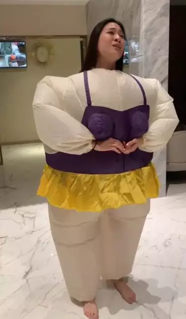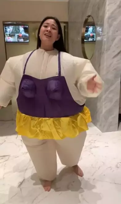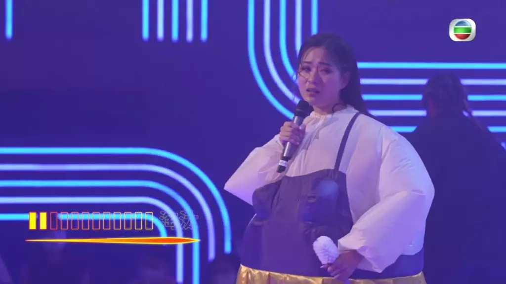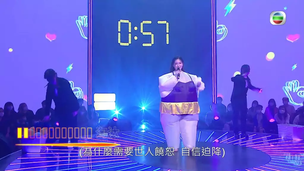 去年落選港姐陳懿德參加《全城一叮》,節目10月13日晚播出,陳懿德着吹氣肥妹裝唱鄭欣宜的《女神》,表演平淡,突然燈光一黑,她脫下肥妹裝,身穿紅色連身裙大展纖瘦身材,全場即刻醒晒,最後成功晉級。