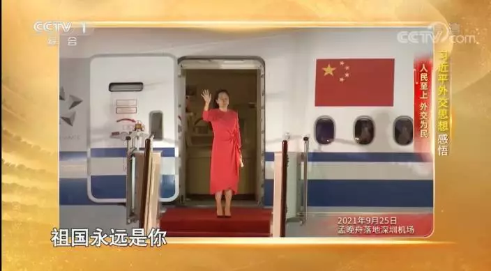 孟晚舟回國時,身穿紅色連身裙,走出機艙,向民眾揮手致意。央視圖片。