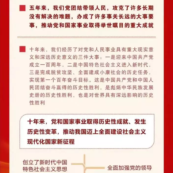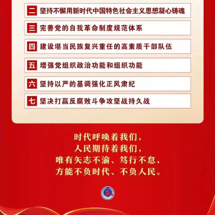 時代呼喚著我們,人民期待著我們。全黨必須牢記,堅持黨的全面領導是堅持和發展中國特色社會主義的必由之路,中國特色社會主義是實現中華民族偉大復興的必由之路,團結奮鬥是中國人民創造歷史偉業的必由之路,貫徹新發展理念是新時代我國發展壯大的必由之路,全面從嚴治黨是黨永葆生機活力、走好新的趕考之路的必由之路。