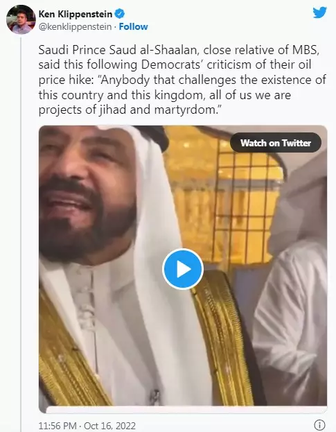 首先是,沙特王子沙蘭(Saud al-Shaalan)上載視頻,用英語和法語警告任何挑戰這個國家和這個王室的人,沙特人是聖戰和殉道的產物。