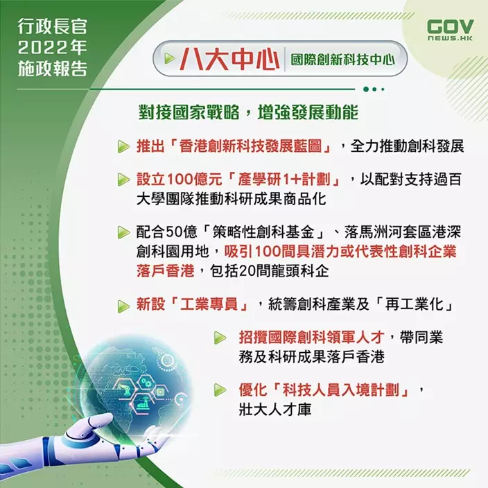 行政長官李家超發表任內首份《施政報告》,創科範疇提出完善創科生態圈、壯大創科人才庫等一系列舉措,力求全速引領香港實現國際創新科技中心的願景。
