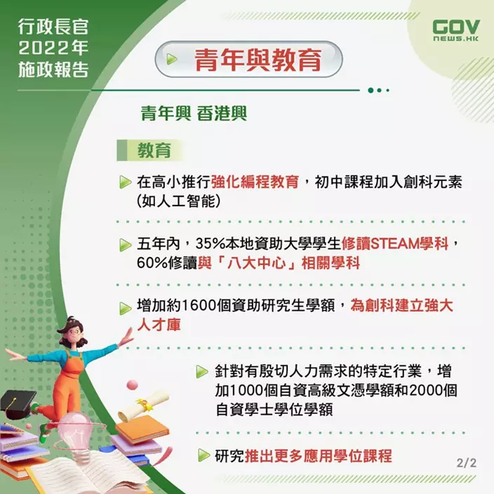政府目標是未來五年內,教資會資助大學的學生當中有35%修讀 STEAM 學科,以及60%修讀與國家「十四五」規劃下香港發展為「八大中心」相關的學科,並增加約1600個資助研究生學額,為創科建立強大人才庫。