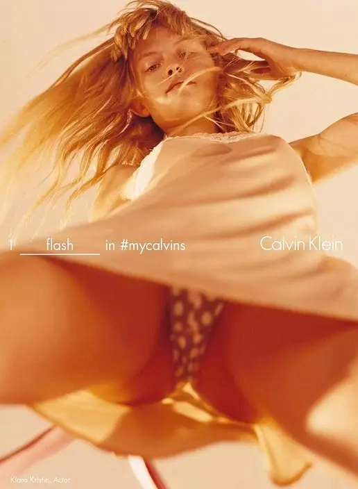 這幅具爭議的廣告照片是23歲女模特兒克里斯廷(Klara Kristin),穿著一條米色的短裙站著,雙腿張開,低頭下望,鏡頭從地下往上拍,攝下她的碎花內褲。廣告的標題說:「我在我的 calvins 中發亮。」