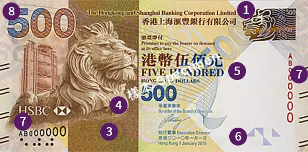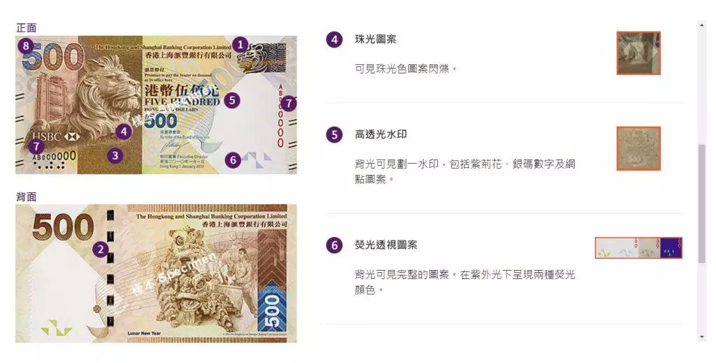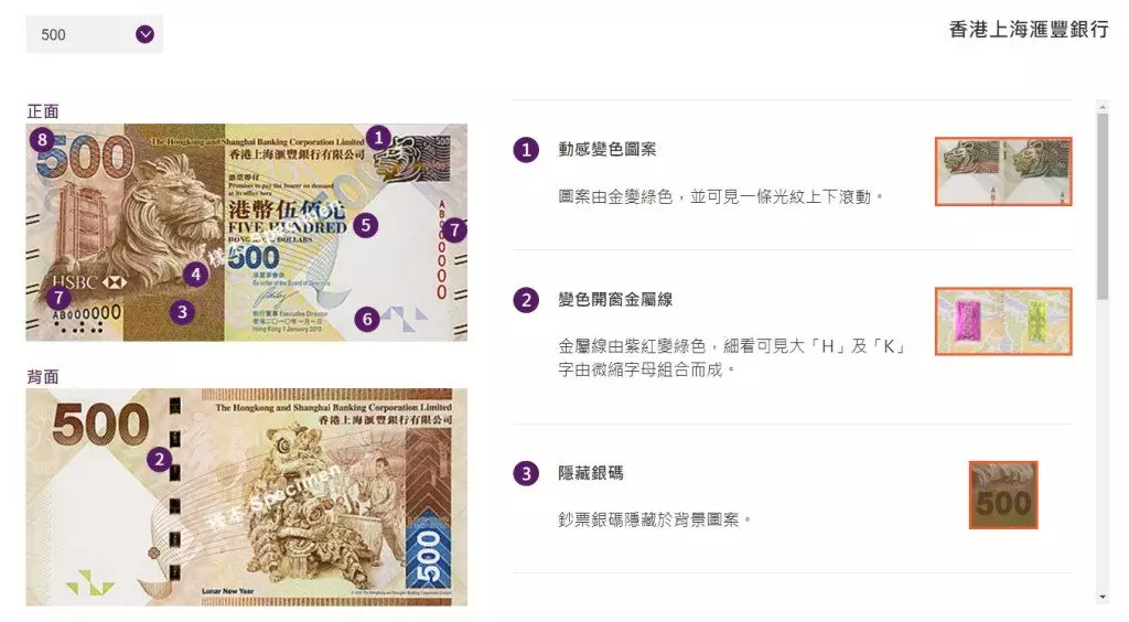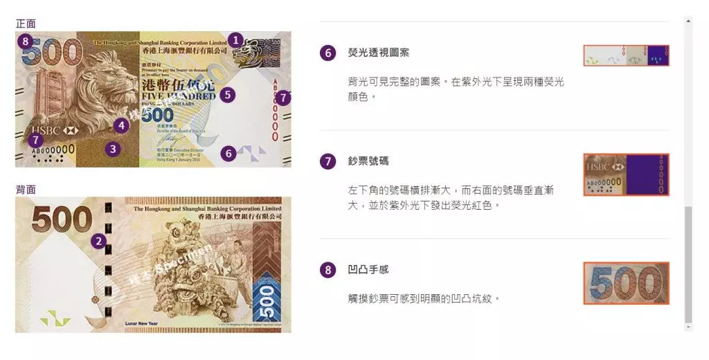 真鈔票的設計與防偽特徵。(金管局網站截圖)