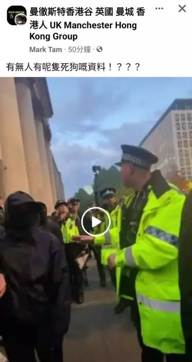 從網上影片可見,英國警察與講廣東話的黑衣示威者對峙,有華裔英國警察疑似協助現場指揮官同示威者溝通。該名警察以一口流利的廣東話,向示威者說明,現在警方有行動在此,如果有人到中國領事館,會被警方拘捕。有黑衣人指,示威者並非罪犯,不斷用有口音的英文反問英警基於什麼依據?(on what ground?)