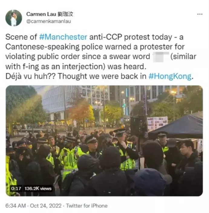 華裔警察其後轉述疑似白人指揮官的話,強調警方已協助示威者進行和平集會,若然有人到領館附近挑起事端,會被拘捕。有黑衣人質疑,「有罪假定是否在英國?我們去,不一定是『搞事』」,期間用廣東「粗口」問候英警,並用狗隻比喻他們。該華裔警察隨即回應,「我警告你不要說粗口,我現在warning你」,該名黑衣人亦被同伙勸喻「不要再講(粗口)」。