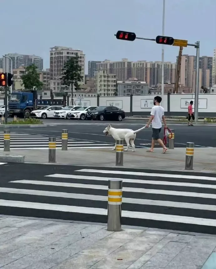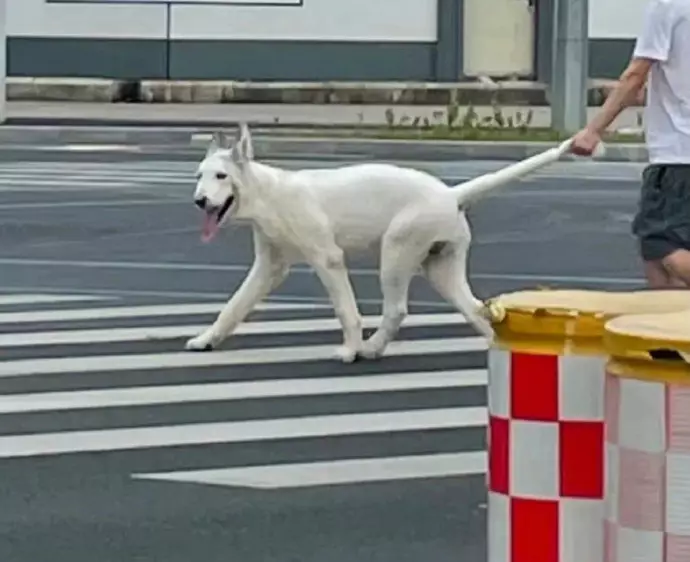 只見第一張圖片中,看似只是平平無奇的飼主遛狗畫面,一隻白色大狗在主人的牽引下乖巧的走著。但放大一看,原來這主人是提著白狗的長尾巴作牽繩,但狗狗看上去還挺開心的,絲毫沒有影響到逛街的心情,就連帖主都說「這狗狗看上去挺通情達理的」。