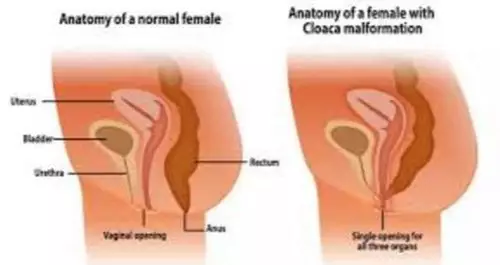 泄殖腔異常病人的直腸、陰道和尿道會如右圖連在一起(網上圖片)