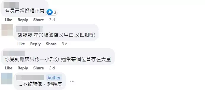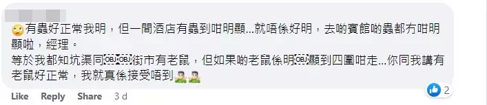 回應的網民也對「有蟲好正常」呢話作出聲討,感嘆「咁都講得出」、「點會有蟲好正常呀,如果比你見到蟲我諗間房已經好多」、「咁嘅處理方式好有問題」、「有蟲已經好唔正常」、「不敢想像,起雞皮」、「下次會答:酒店有鬼很正常,只係睇到同睇唔到嘅分別」。