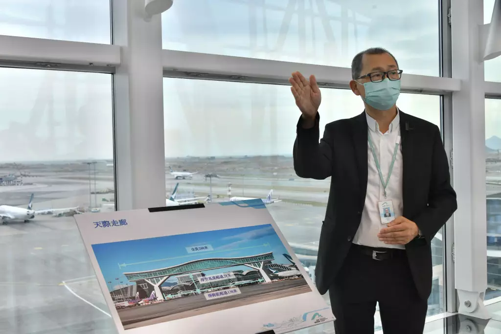 天際走廊工程早在2018年已展開,原本預計在2020年暑假落成,但因疫情等原因而延遲。梁永基表示,因應疫情與內地交通受到影響,天際走廊推遲到今天才開幕,但機管局和政府之間一直都有保持緊密的溝通,相信天際走廊會有一定的使用率,而需求量在未來亦會逐步增加。