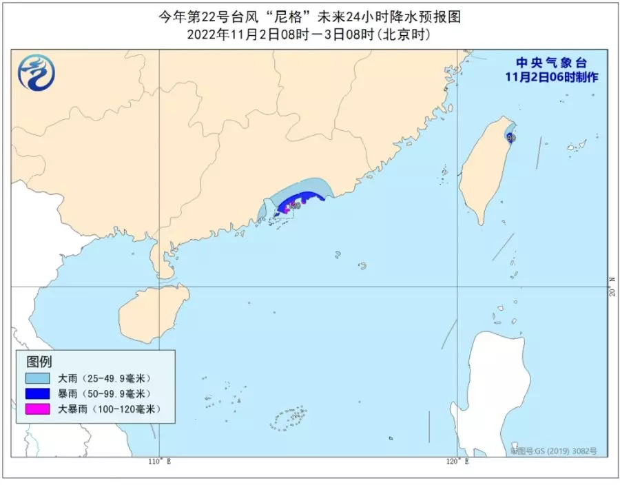 同時內地中央氣象台傍晚發布藍色颱風預警,「尼格」已於2日下午減弱為熱帶風暴級,下午5點鐘其中心位於廣東省珠海市東偏南方向大約165公里的南海東北部海面上,中心附近最大風力有9級(23米/秒),七級風圈半徑180-350公里。珠江口附近及其沿海、香港沿海、澳門沿海及深圳部分沿海將有9級大風,陣風可達1 0 -1 1級。