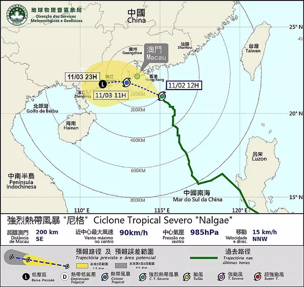熱帶氣旋「尼格」將於今日(2日) 晚間至明日(3日)初時在澳門約100公里範圍內掠過。氣象局圖片