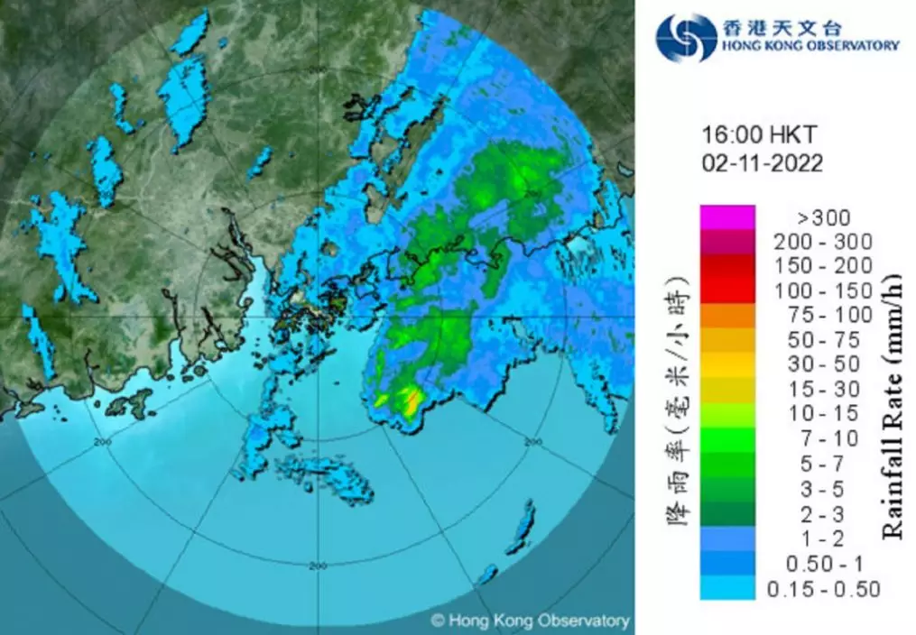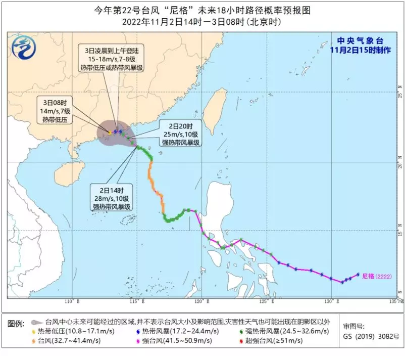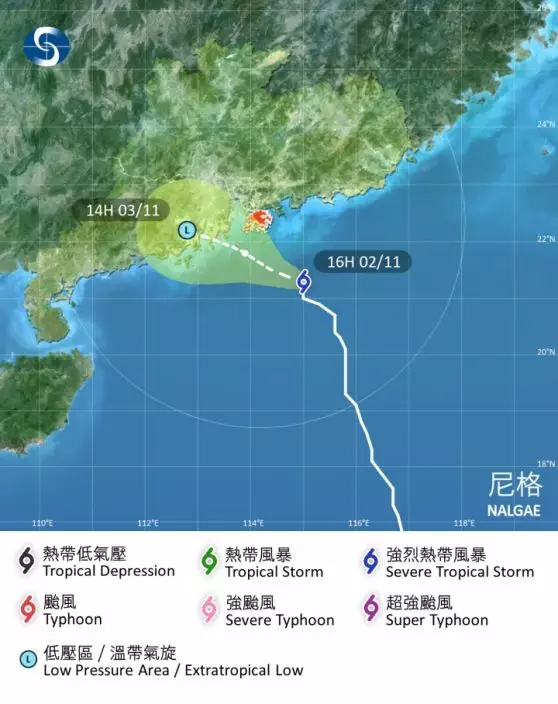 11月2日下午4時,強烈熱帶風暴尼格集結在香港之東南約140公里,即在北緯21.3度,東經115.0度附近,預料向西北移動,時速約10公里,靠近珠江口一帶。