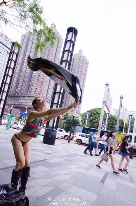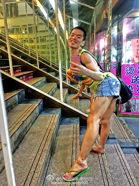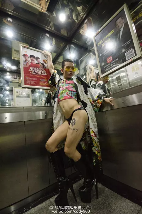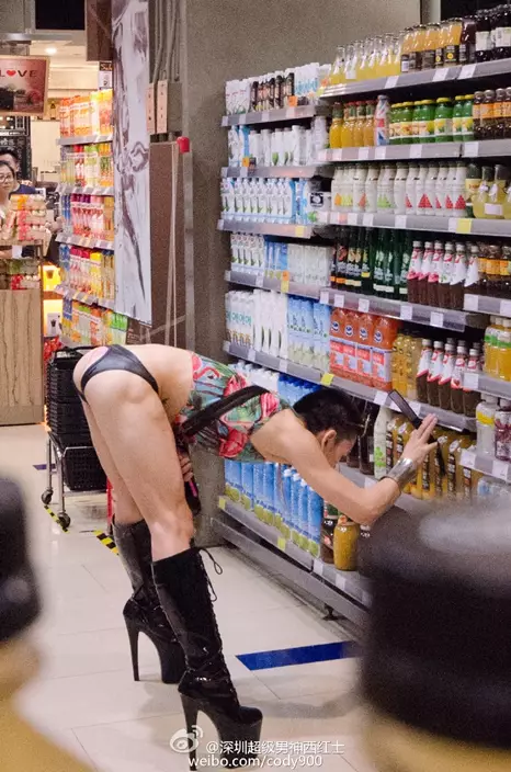 最近網上流傳幾張照片,一名易服男穿上六吋高皮靴、緊身背心和露出T-back內褲,在深圳一間超級市場選購物品,毫不理會途人奇異目光。有網民搜索資料發現他衣着打扮一向誇張,而且頗自戀!