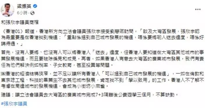 全國政協副主席、前特首梁振英今日在社交平台facebook點名講到張欣宇的評論,強調「沒有人要將、也沒有人可以將香港人『送去』邊度,但香港人要知道在大灣區其他城市的事業發展機遇,而且要破除偏見和成見」。