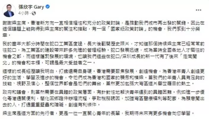 相隔約兩小時,張欣宇亦在專頁回應。他首先感謝梁主席,香港新方向一直相信理性和充分的政策討論,是推動香港再出發的關鍵,因此在這個議題上得到梁主席的關注和指點,有一個「國家級政策討論」的機會,感到十分榮幸。